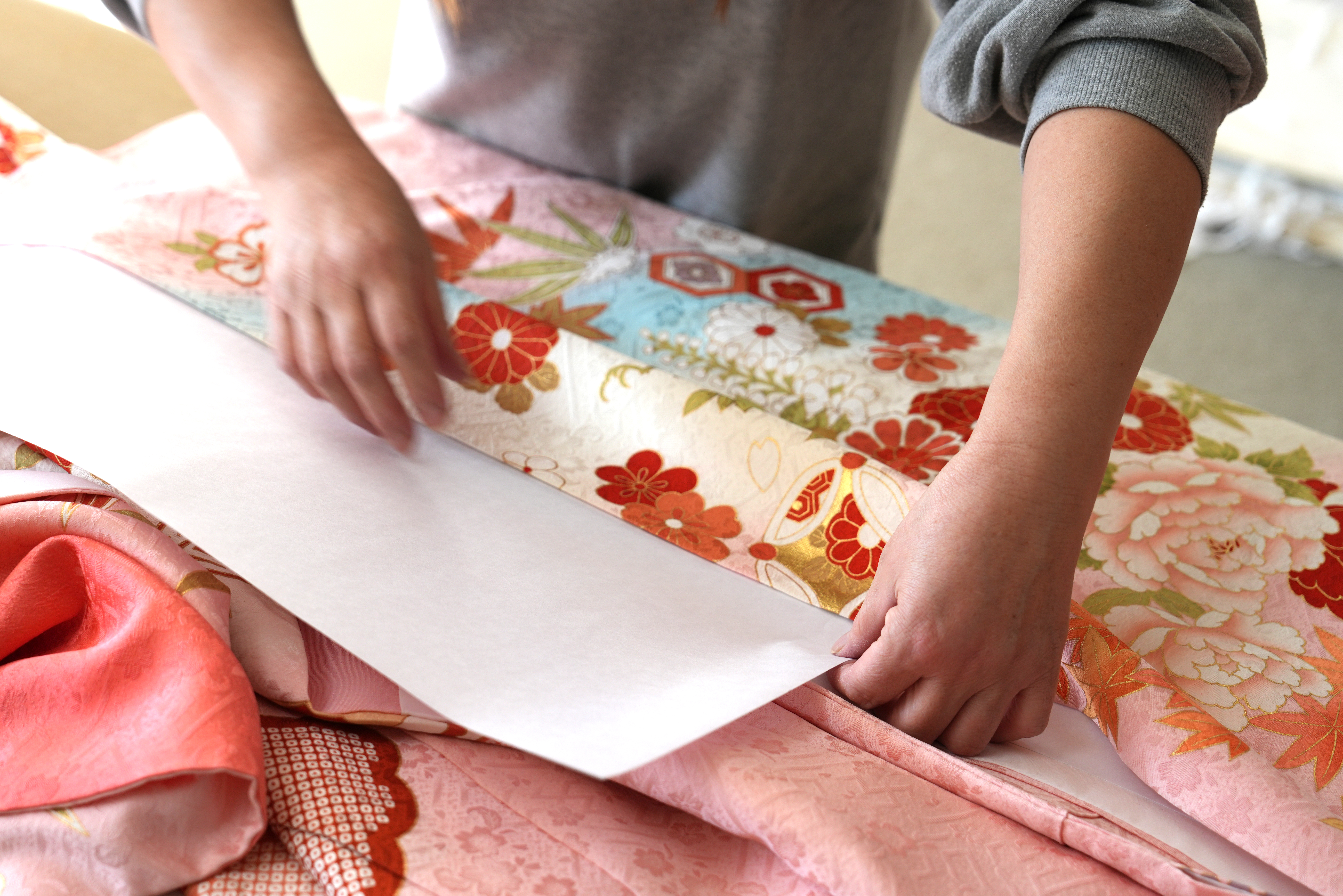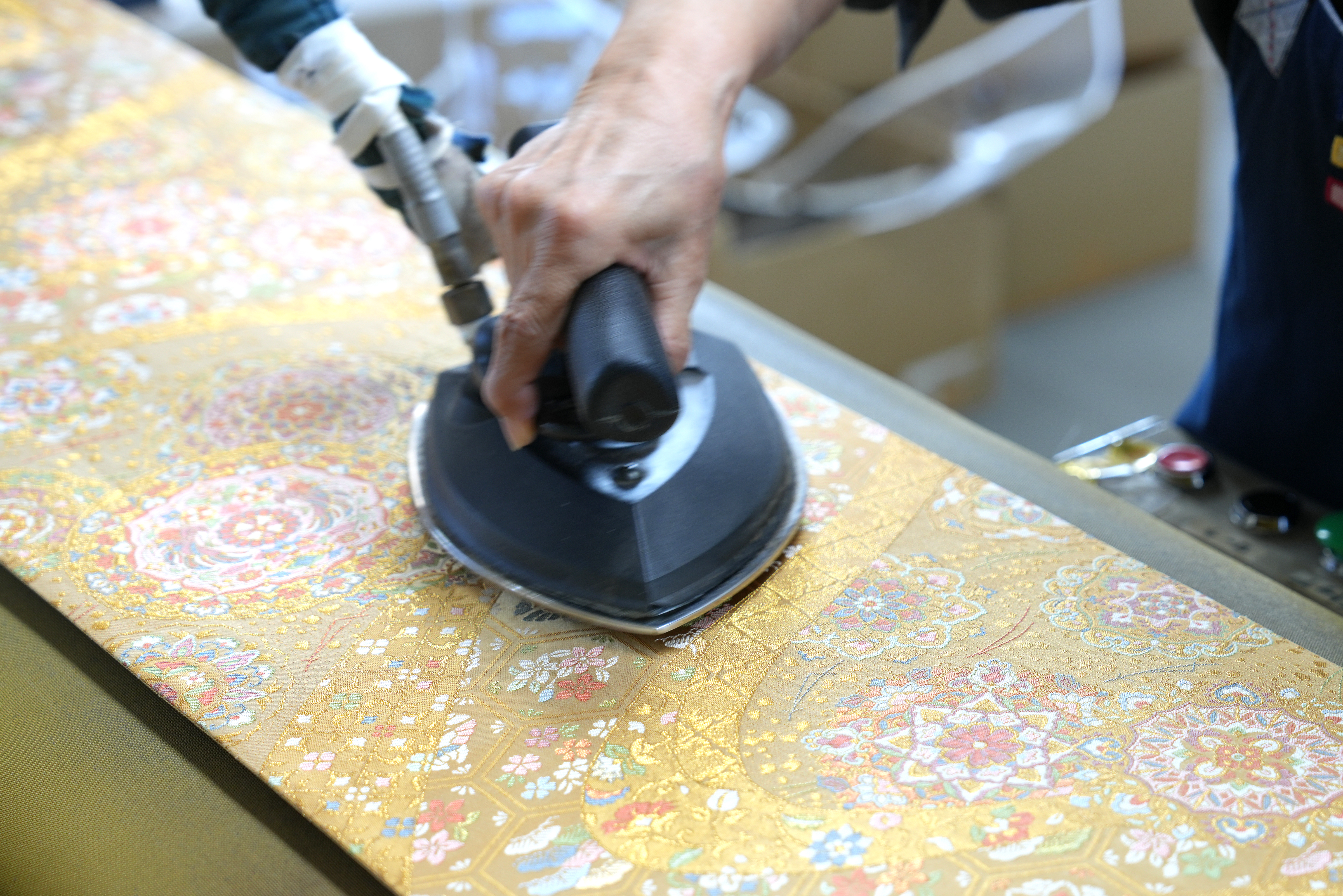 プレスは、帯や着物を美しい状態に仕上げるための重要な工程です。専用の機械と職人の熟練した技により、生地の風合いを損なわずにシワを伸ばし、形を整えます。仕立て映えを高め、品格ある仕上がりを実現するため、丁寧で繊細なプレス作業を行っています。
