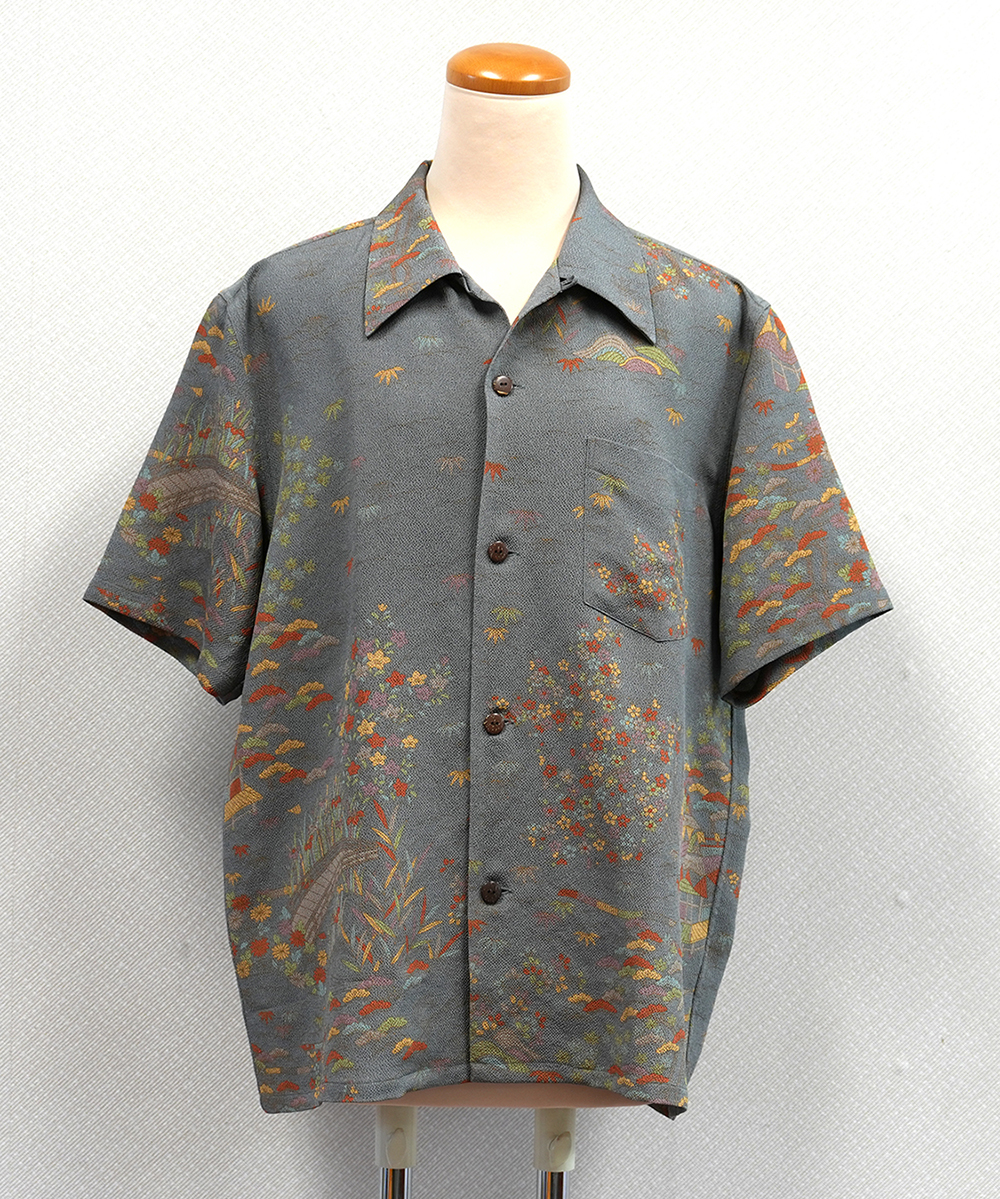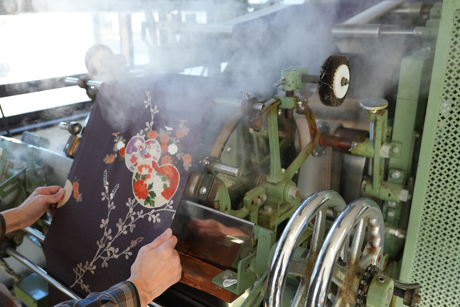 呉服店のこだわりをシャツにアロハシャツになる正絹生地は、お仕立てに入る前に湯のし加工を施し、布地の張りや艶、風合いを最良の状態へと整えます。繊細な素材に合わせて温度や圧を調整し、歪みや縮みを均一に調整することで、後の裁断や縫製が美しく進む理想の生地へと仕上げていきます。